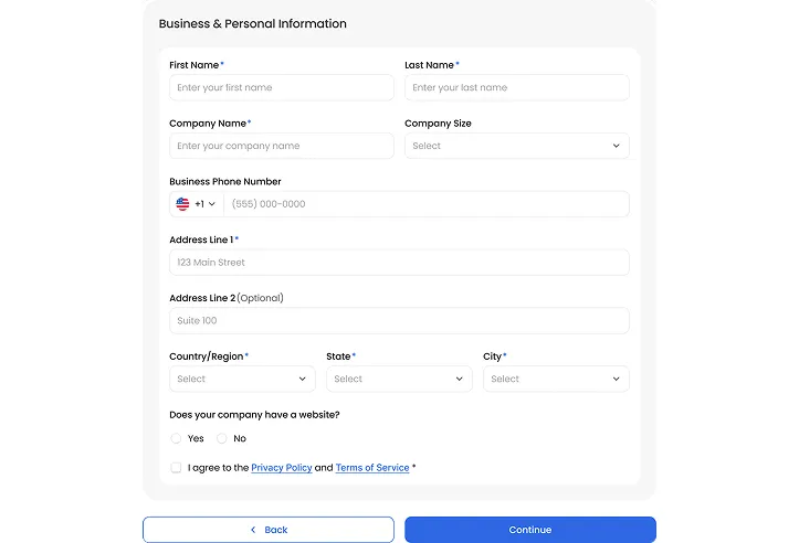 Fill in your name, company, address, and phone number.